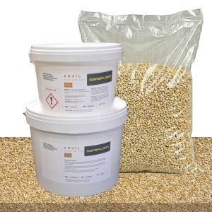 Når limen er omhyggeligt blandet, skal den tilsættes til stenene. Vores limkit på 7,5 kg skal blandes med 100 kg sten, hvilket svarer til 4 sække á 25 kg. Når limen er blandet med stenene, er du klar til at støbe.