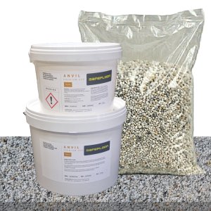 Når limen er omhyggeligt blandet, skal den tilsættes til stenene. Vores limkit på 7,5 kg skal blandes med 100 kg sten, hvilket svarer til 4 sække á 25 kg. Når limen er blandet med stenene, er du klar til at støbe.